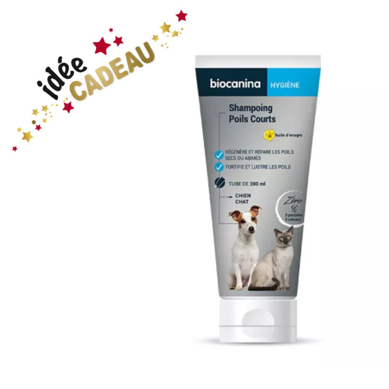 Le shampoing poils courts chien et chat de Biocanina est formulé sans paraben ni colorant. Il est idéal pour l'hygiène des chiens et chats. Il régénère et répare les poils secs et abîmés. Sans risque d'irritation pour la peau des animaux, le shampoing Biocanina ne contient pas de silicone, sa formule est constituée d'une base lavante douce sans Lauryl éther Sulfate (LES) associée à de l'huile d'Onagre qui contribue à réparer efficacement les poils secs et abîmés ou ternes tout en accélérant la repousse des poils. Après chaque utilisation, le pelage des animaux est hydraté et protégé durablement.