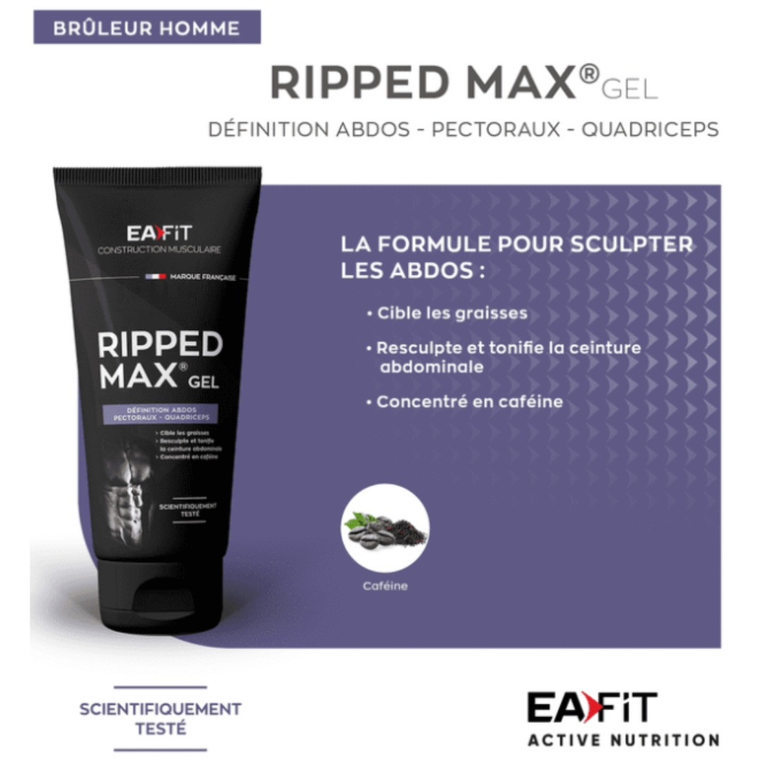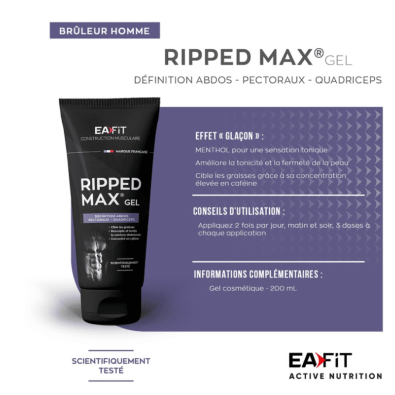 RIPPED MAX GEL est un produit destiné aux hommes souhaitant dessiner leurs abdos, pectoraux et quadriceps.