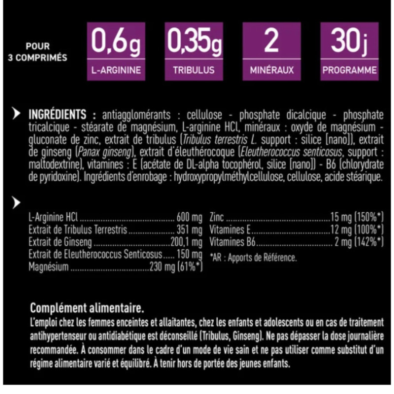 Ingrédients : antiagglomérants : cellulose - phosphate dicalcique - phosphate tricalcique - stéarate de magnésium, L-arginine HCI, minéraux : oxyde de magnésium - gluconate de zinc, extrait de tribulus (support : silice [nano]), extrait de ginseng, extrait d’éleuthérocoque (support : maltodextrine), vitamines : E (silice (nano]) - B6.