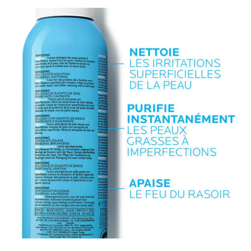 Serozinc de La Roche-Posay est une solution en spray purifiante et apaisante, spécialement formulée pour les peaux grasses et sujettes aux imperfections. Enrichi en sulfate de zinc, ce soin multi-usages aide à matifier la peau, à réduire l'apparence des pores dilatés et à apaiser les irritations cutanées. Serozinc est idéal pour les peaux à tendance acnéique, ainsi que pour celles et ceux souffrant de rougeurs ou de brillances excessives.