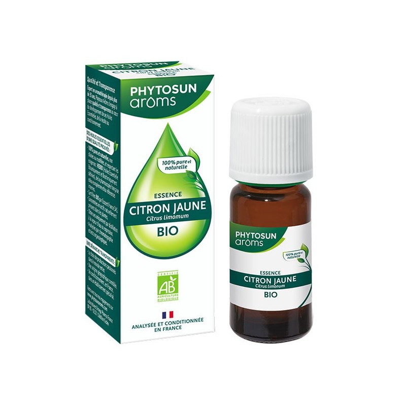 Phytosun Arôms Essence Citron Jaune (Citrus limonum) Bio 10 ml est un complément alimentaire sous forme d'huile essentielle bio 100% pure et naturelle (non diluée, non modifiée).