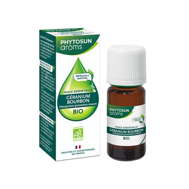 Phytosun Arôms Huile Essentielle Géranium Bourbon (Pelargonium graveolens roseum) Bio 10 ml est un complément alimentaire sous forme d'huile essentielle bio 100% pure et naturelle (non diluée, non modifiée).