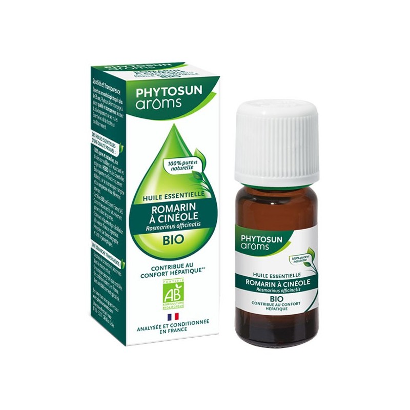 L'Huile Essentielle Romarin A Cinéole Bio de Phytosun Aroms est à base de Rosmarinus officinalis , connu pour ses bienfaits sur l’organisme : participe au maintien des fonctions physiologiques purificatrices ; soutient le drainage hépatobilaire, le foie et le fonctionnement biliaire, le système immunitaire ; traditionnellement utilisé pour contribuer à l’élimination rénale et pour faciliter la digestion.