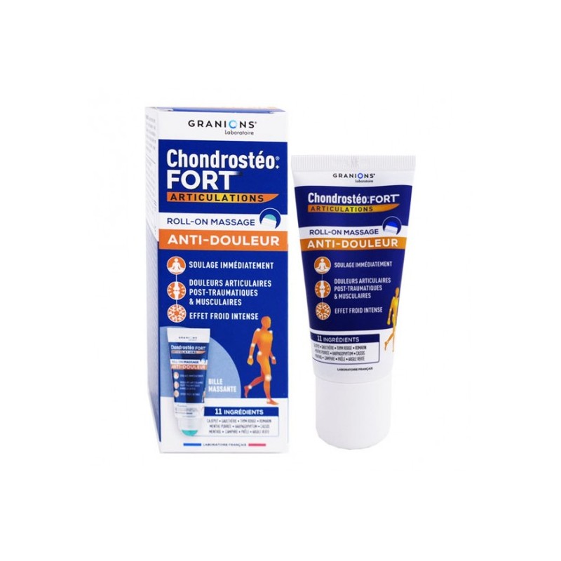 - Chondrostéo+ Fort Articulations Roll-on soulage et apaise immédiatement les douleurs articulaires, post-traumatiques et musculaires grâce à l' action mécanique de la bille de massage associée à l' effet froid intense qu' il procure.