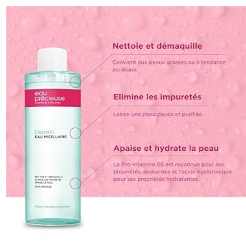Eau Précieuse Clearskin Eau Micellaire est un soin démaquillant et nettoyant spécialement formulé pour les peaux grasses à tendance acnéique. Elle s'utilise en tant que soin nettoyant quotidien et ne nécessite pas de rinçage.
