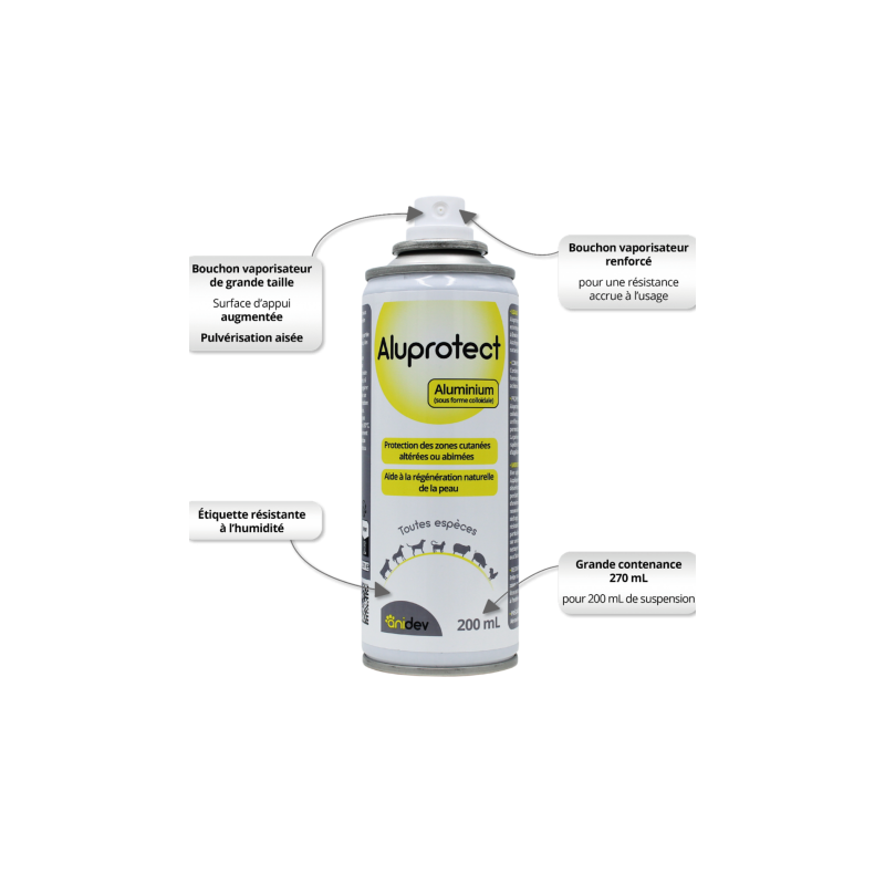 Aluprotect est un spray à base d'aluminium colloïdal, résistant à l'eau. Il forme un film protecteur métallisé, fin et flexible permettant à la peau de respirer. La pulvérisation permet une couverture rapide et facile y compris de zones d'application larges. Aluprotect protège des agressions extérieures (insectes, humidité) et aide à limiter la prolifération microbienne. Astringent, il favorise la régénération naturelle de la peau.