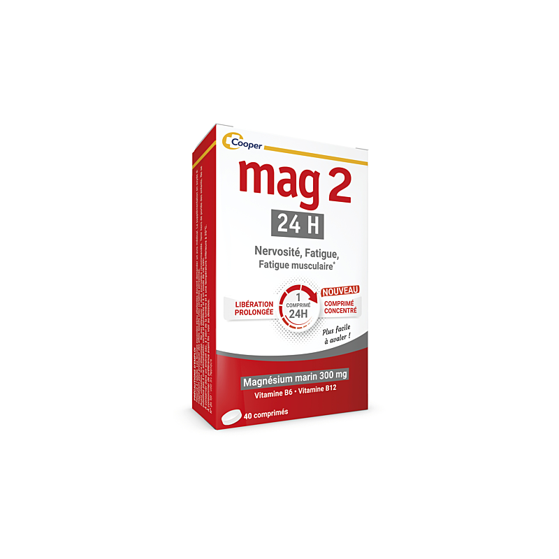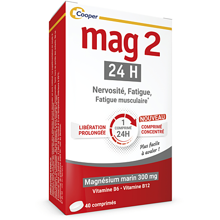 Mag 2 des Laboratoires Cooper, complément alimentaire à base de magnésium marin et vitamine B6, qui participent à la réduction de la fatigue et contribuent au fonctionnement normal du système nerveux.