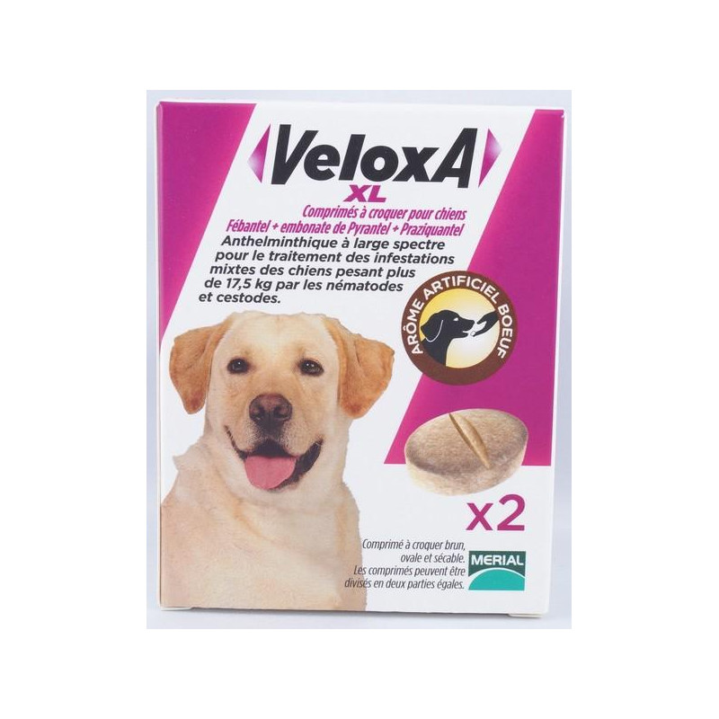 La formule innovante de Veloxa Chien XL, aromatisée au boeuf, permet une administration plus aisée à l'animal. L'association unique des 3 molécules Fébantel, Pyrantel et Praziquantel en font une référence en matière de lutte contre les vers.