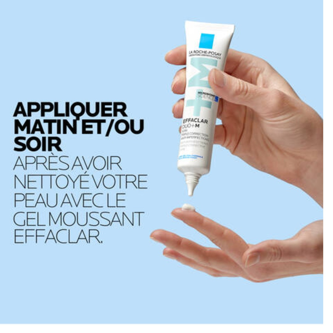 Effaclar DUO+M de La Roche-Posay est un soin triple correction anti-imperfections, désormais enrichi par la science du microbiome, pour une efficacité ciblée, même sur les imperfections sévères : anti-boutons, anti-points noirs, anti-marques post-acné et anti-rechute. Désormais efficacité visible dès 8h*. Anti-boutons, anti-points noirs, anti-marques post-acné. Anti-rechute**. Hypoallergénique. Non comédogène. Testé sous contrôle dermatologique.