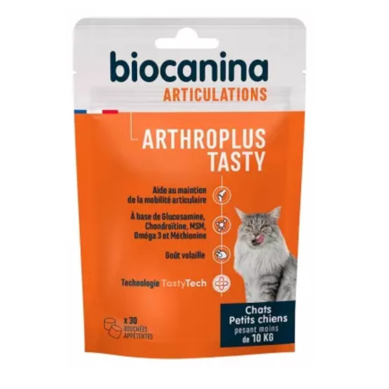 Biocanina Arthroplus Tasty Chats et Petits Chiens (moins de 10 kg) 30 Bouchées Appétentes est un aliment complémentaire diététique, destiné au soutien du métabolisme des articulations en cas d'arthrose. Il aide également à maintenir la souplesse et la mobilité des articulations chez les animaux présentant des difficultés articulaires.