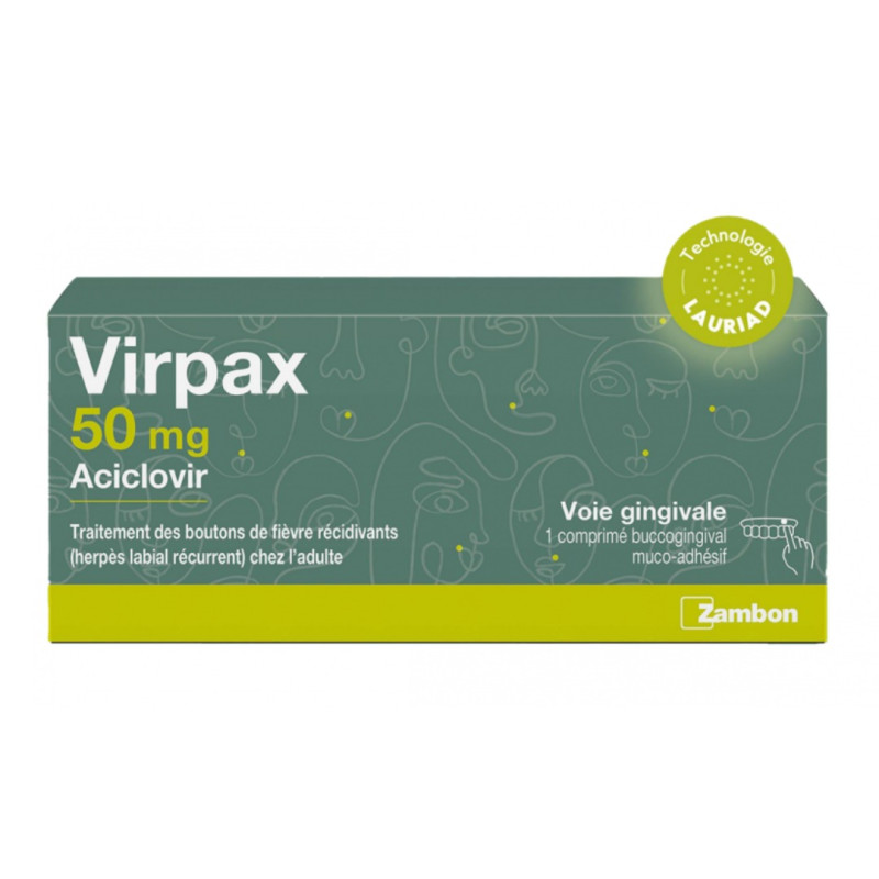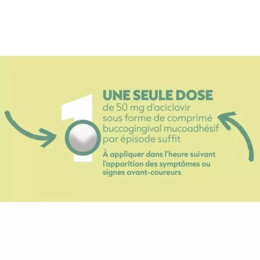 La substance active est l’aciclovir. Chaque comprimé buccogingival muco-adhésif contient 50 mg d’aciclovir