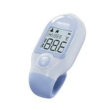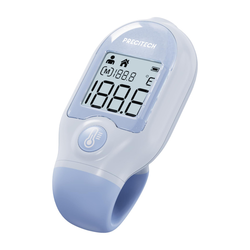 Le thermomètre sans contact Precitech Triple Sensor de couleur Bleu mesure la température corporelle, des objets ou de l'environnement en moins d'une seconde, grâce à ses trois capteurs infrarouge, distance et température ambiante.