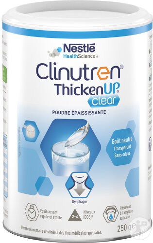 Clinutren ThickenUp Clear est une poudre épaississante pour liquides et semi-liquide à base de gomme xanthane en cas de troubles de la déglutition.