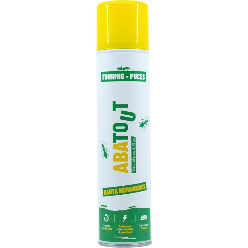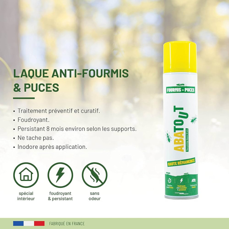 Abatout Fourmis Puces Laque 300 ml est un foudroyant à haute rémanence pour fourmis et puces qui offre un effet immédiat et persistant et une protection jusqu'à 8 mois.