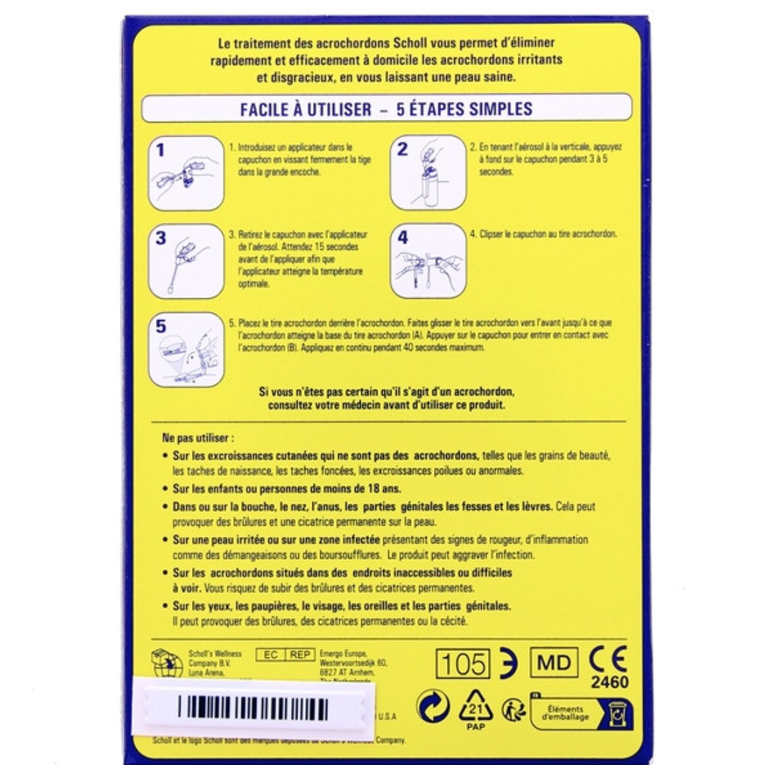 Tenir hors de portée des enfants. Éviter le contact avec les yeux. Ne pas inhaler et n'utiliser que dans des endroits bien ventilés. Ne pas manger. Pour usage externe uniquement. A n'utiliser que conformément aux instructions. Si vous n'êtes pas certain qu'il s'agit d'un acrochordon, consulter votre médecin avant d'utiliser ce produit. Ne pas pulvériser le gaz directement sur la peau. Une mauvaise utilisation de ce produit peut entraîner des brûlures et la détérioration de tissu sain, voire la cécité. Ne pas utiliser si vous êtes diabétique, vous avez une mauvaise circulation sanguine ou si vous avez reçu un diagnostic d'affections sanguines liées au froid extrême. Ne pas utiliser si vous êtes enceinte ou si vous allaite