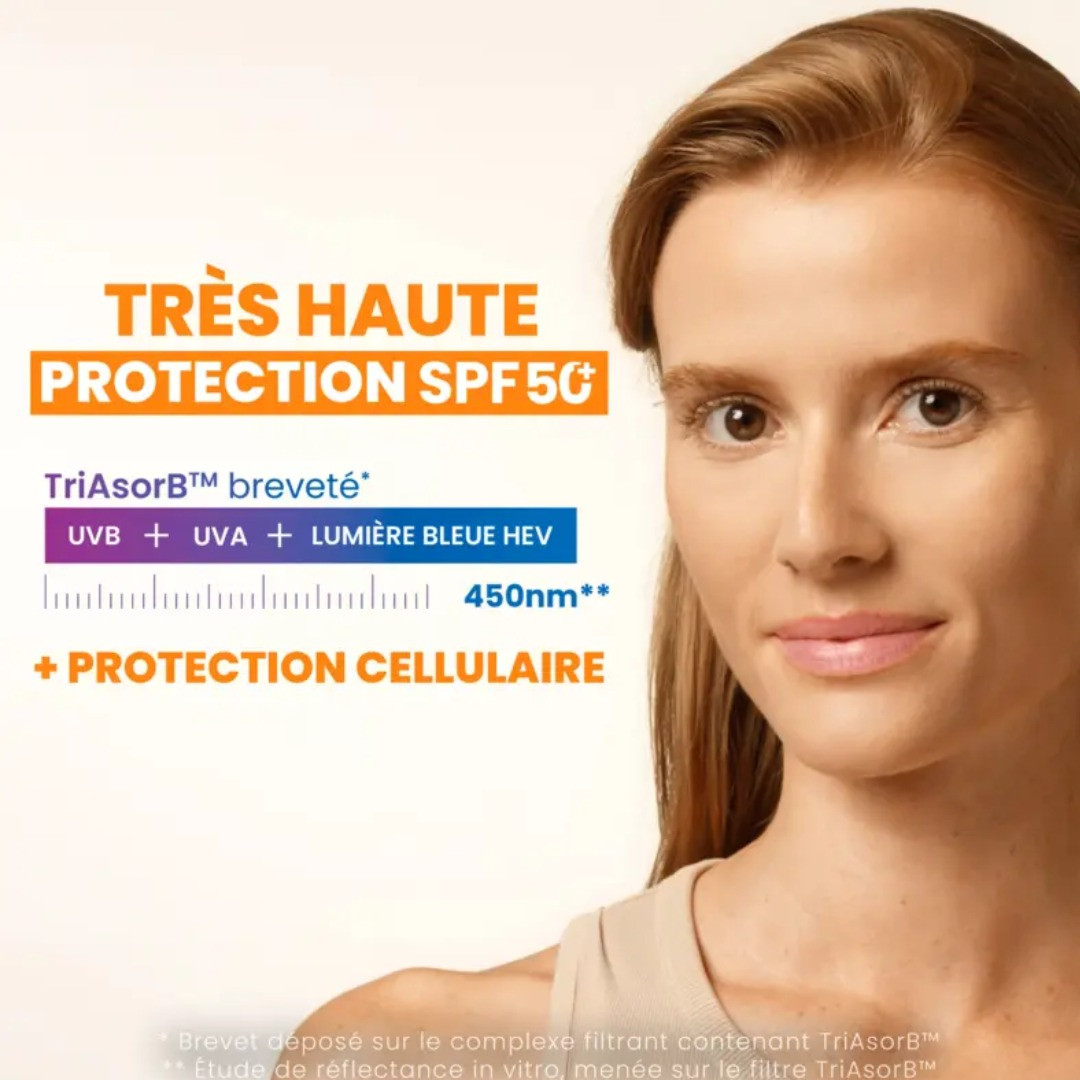- Une très haute protection solaire contre les UVB, UVA, et la Lumière Bleue HEV grâce au système photoprotecteur intégrant le filtre breveté Triasorb™