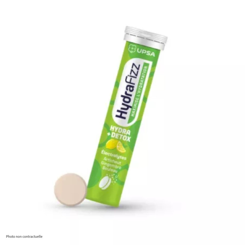 HydraFizz Hydra+Détox est un complément alimentaire contenant de l'artichaut, du gingembre, de la vitamine C et du bouleau pour aider à la détoxification du corps, favoriser l'élimination des graisses, soutenir le système digestif et protéger les cellules contre le stress oxydatif ;