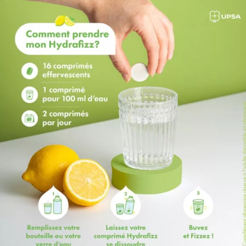 Il suffit de diluer un comprimé effervescent UPSA HydraFizz dans un verre d'eau puis de le boire pour bénéficier d'une action hydratante et désaltérante !