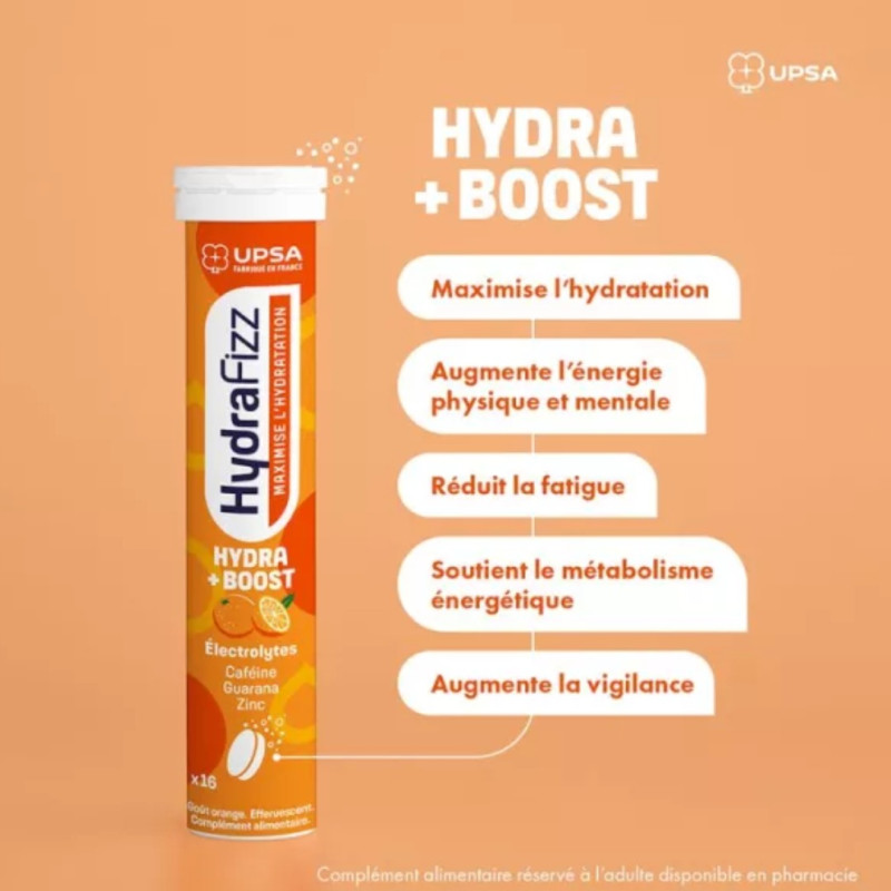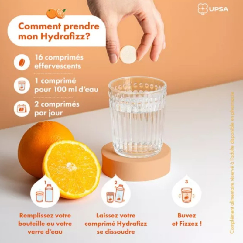 UPSA HydraFizz est un complément alimentaire dont l'usage est réservé à l'adulte. Il est indiqué de prendre deux comprimés effervescents par jour, à dissoudre dans un grand verre d'eau (200 ml).